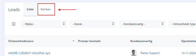 Når der rykkes rundt på leads i Kanban-visningen, ændres status automatisk alle steder den fremgår.