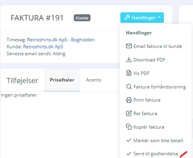 Faktura sendes til godkendelse via den øverste handlingsknap -> send til godkendelse.