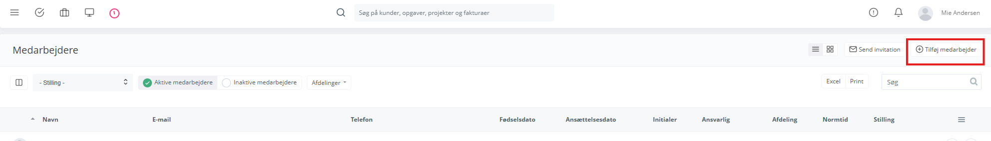 Under fanen Team > Medarbejdere finder du i højre hjørne knappen "Tilføj Medarbejder".