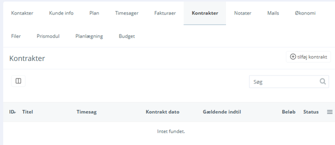Kontraktmodulet gør det nemt at oprette, administrere og overvåge kontrakter for hver enkelt kunde, herunder tilknyttede projekter og deadlines. Du kan hurtigt oprette nye kontrakter ved at klikke på "tilføj kontrakt".