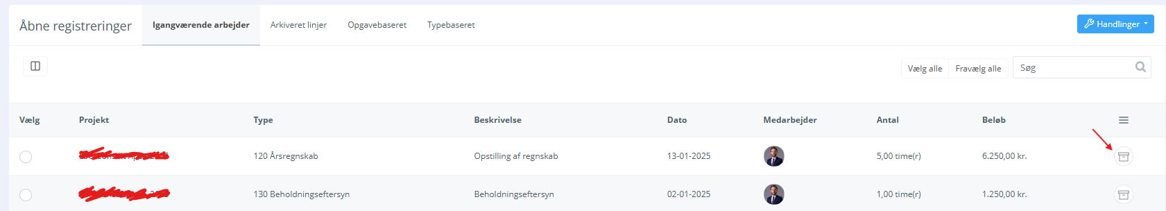 I forbindelse med faktureringen, kan der naturligvis tages stilling til- og behandles linjer som skal nedskrives. Dette gøres ved at klikke på knappen "arkivér". En arkivering af en linje behandles på samme måde som en nedskrivning - den eneste forskel er, at det kan gendannes igen direkte fra fakturamodulet.