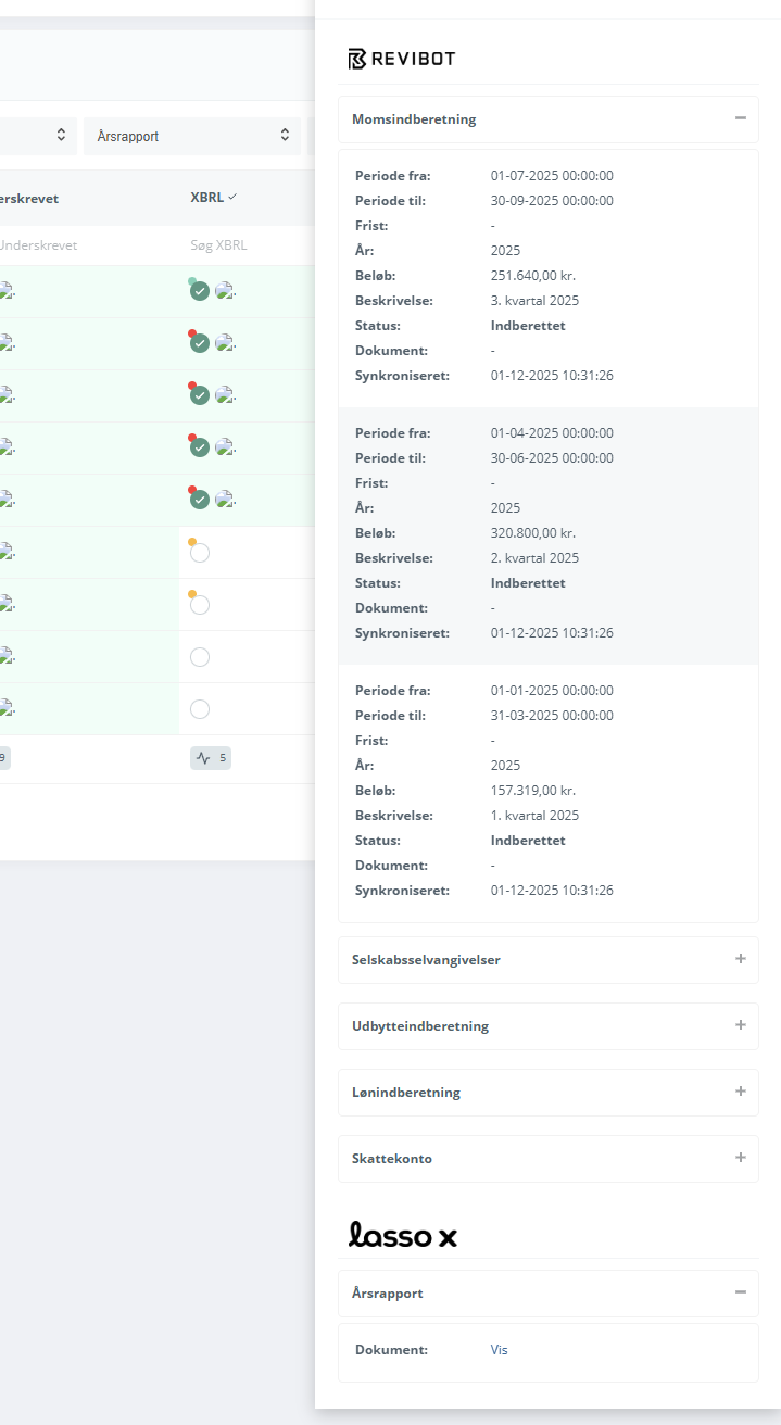 - I nedenstående eksempel har vi valgt en statusliste kaldet "Årsregnskaber", hvor vi har en kolonne kaldet "Selvangivelser". Her ønsker vi at kontrollere mod Revibot modulet "Selskabsselvangivelser".
