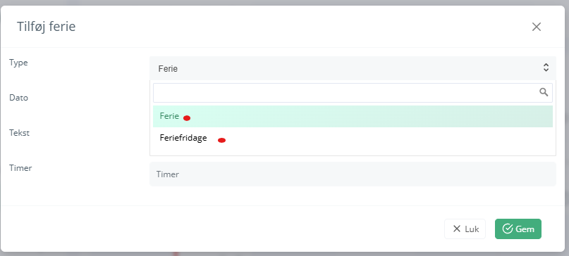 Ved klik på knappen, kan der skelnes mellem ferie og feriefridage: