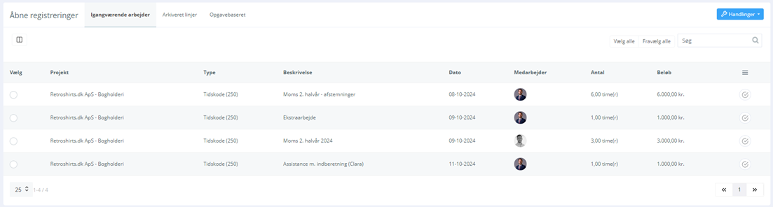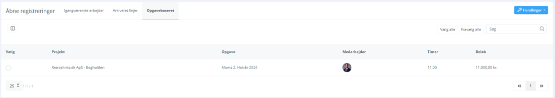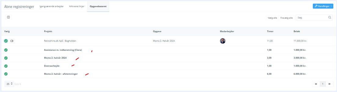 Klikkes der på de grupperede opgaver, vil selve grundlaget (altså de enkelte transaktioner) udfolde sig i en dropdown-liste. Her kan enkelte klikkes fra, såfremt de skal faktureres på et senere tidspunkt.